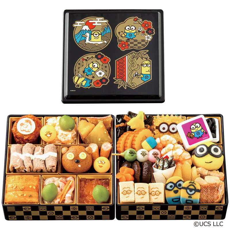 伝統的なおせち料理に、ミニオンキャラクターのキュートな食材が詰まっています。